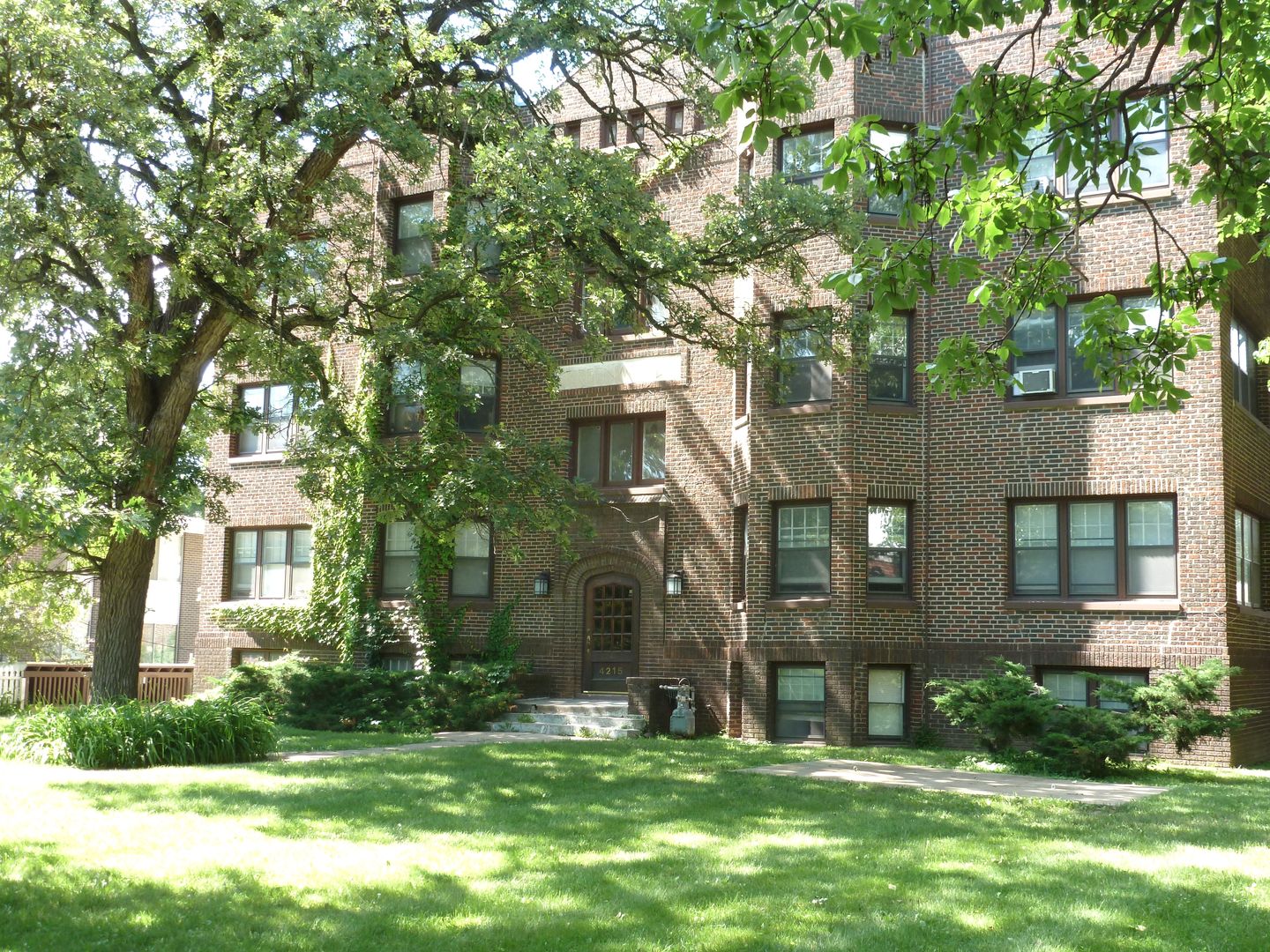 The stately brick Greenwood Apartments are situated back from the street behind a large lawn area. With no other apartments close by, this setting provides a peaceful retreat.